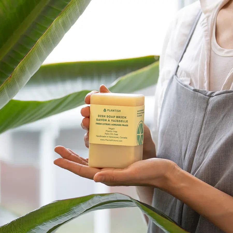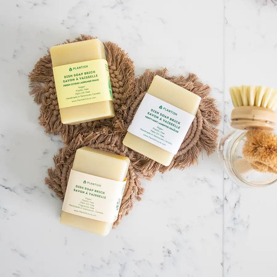 Our bestseller solid dish soap brick (13oz) is now available in Fresh Citrus! This plastic free dish soap eliminates the need to purchase dish soap in plastic bottles. Gentle on the hands, it cuts grease effectively and pairs perfectly with a dishcloth, loofah, and natural bristle brushes. It is also a powerful stain remover for any oil and stain on fabrics such as sponge cloths and produce bags.